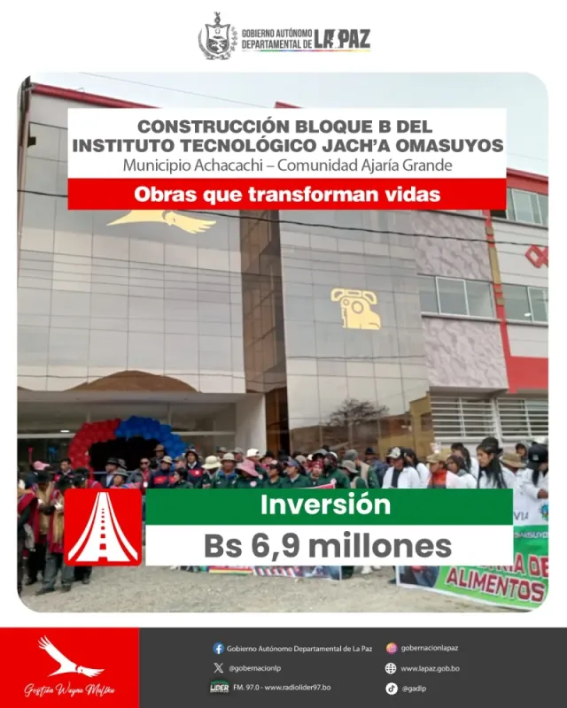 El Gobernador de La Paz, Santos Quispe, viajó al municipio de Achacachi para entregar el Bloque B del Instituto Tecnológico Jach’a Omasuyos. Esta nueva infraestructura, finalizada el 26 de octubre de 2025, representa una inversión de Bs 6,9 millones y está diseñada para reforzar los servicios educativos de calidad. El bloque incluye ambientes esenciales para la formación tecnológica y profesional, tales como aulas, laboratorio, sala de computación, talleres, baños y sala de reuniones.