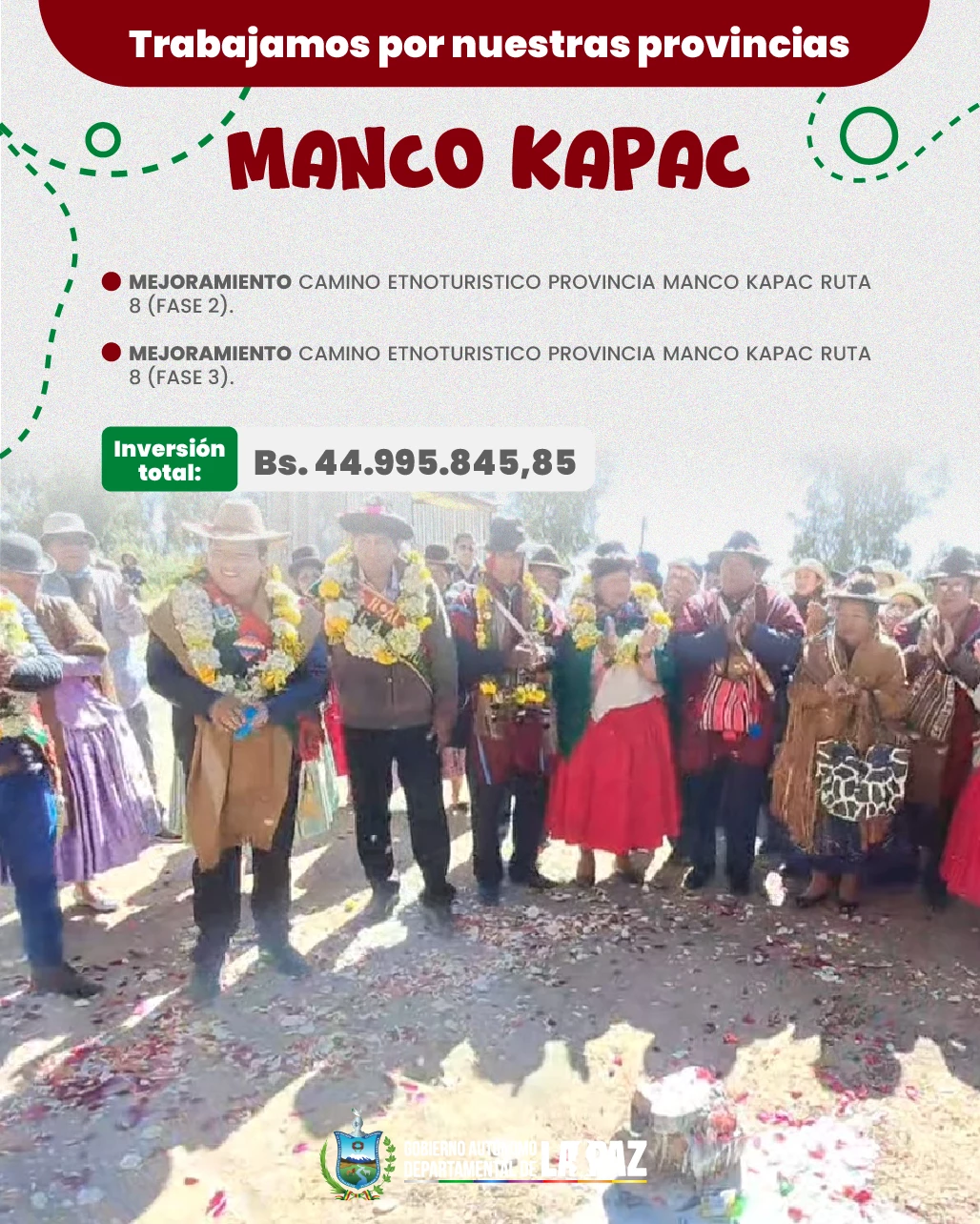 Los proyectos que se tiene en cronograma son la mejora de tramos carreteros estratégicos, como la vía Cañaviri–Chilahuala–Río Mulato–Papel Pampa–límite departamental (fase 3), la vía Lahuachaca–Cruce San José (fases 2 y 3) y el camino Tambillo–Santa Rosa de Taraco–Tiahuanacu (fase 1).