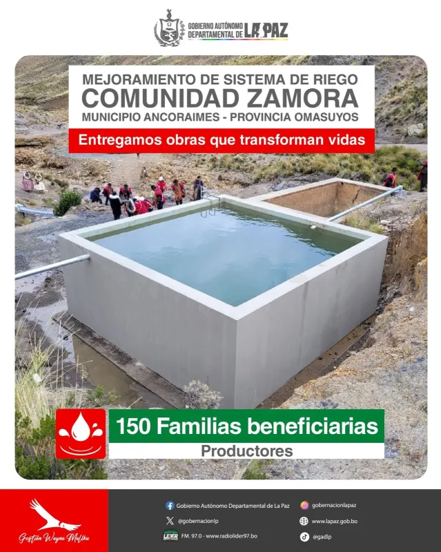 El proyecto de Mejoramiento del Sistema de Riego Zamora fue entregado oficialmente en mayo de 2025 en un ambiente de celebración comunal. La infraestructura implementada permite una distribución más eficiente del agua, reduciendo las pérdidas por filtración y garantizando que el recurso llegue de manera constante a las parcelas. Esta mejora es vital para que las 15 familias beneficiarias puedan mantener su producción agrícola frente a los desafíos climáticos, fortaleciendo la vocación productiva del municipio de Ancoraimes y mejorando la calidad de vida en el área rural de la Provincia Omasuyos.