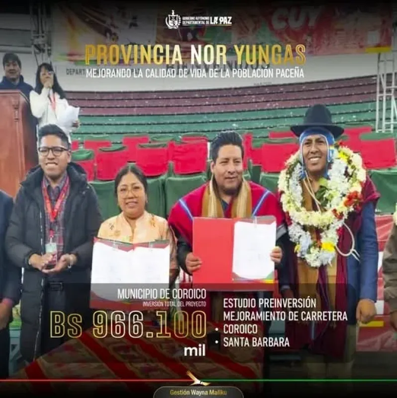 El Gobernador de La Paz se reunió con autoridades municipales de Coroico para coordinar y tratar el tema del Estudio de Diseño Técnico (EDTP) necesario para el Proyecto de Mejoramiento de la carretera Coroico - Santa Bárbara. La inversión asociada a esta importante iniciativa vial asciende a Bs 966.100 mil, reflejando el compromiso por mejorar la conectividad y seguridad en la provincia Nor Yungas.