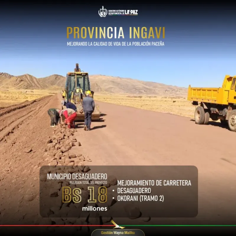 El gobernador Santos Quispe, acompañado de diferentes autoridades, marcó el inicio de la construcción con el colocado de la piedra fundamental del proyecto "Mejoramiento de la Carretera Desaguadero - Okorani (Tramo 2)" en 2024. Esta obra en ejecución, que abarca una longitud de $6.93 \text{ KM}$, es vital para el desarrollo logístico de la provincia Ingavi, especialmente para la zona fronteriza. La inversión total destinada a este tramo asciende a Bs 18,6 millones y tiene como objetivo principal beneficiar directamente a los habitantes de las diferentes comunidades, comerciantes y transportistas que utilizan esta ruta.