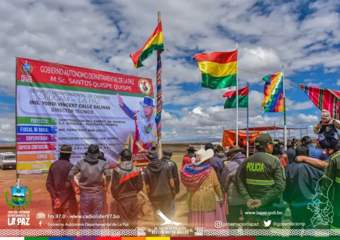 Cr. Troncal San Andrés de Machaca a Nazacara - Hito 40 Tramo 1 / Mejoramiento de la carretera Nazacara – Hito 40 (Tramo I) El Gobernador Santos Quispe estuvo presente en el municipio de San Andrés de Machaca para la entrega oficial de la obra de mejoramiento de la carretera Nazacara – Hito 40 (Tramo I). Este proyecto concluido forma parte del corredor Cruce Troncal San Andrés de Machaca a Nazacara - Hito 40 y es fundamental para la conectividad interna y el acceso a la zona fronteriza de la provincia Ingavi.