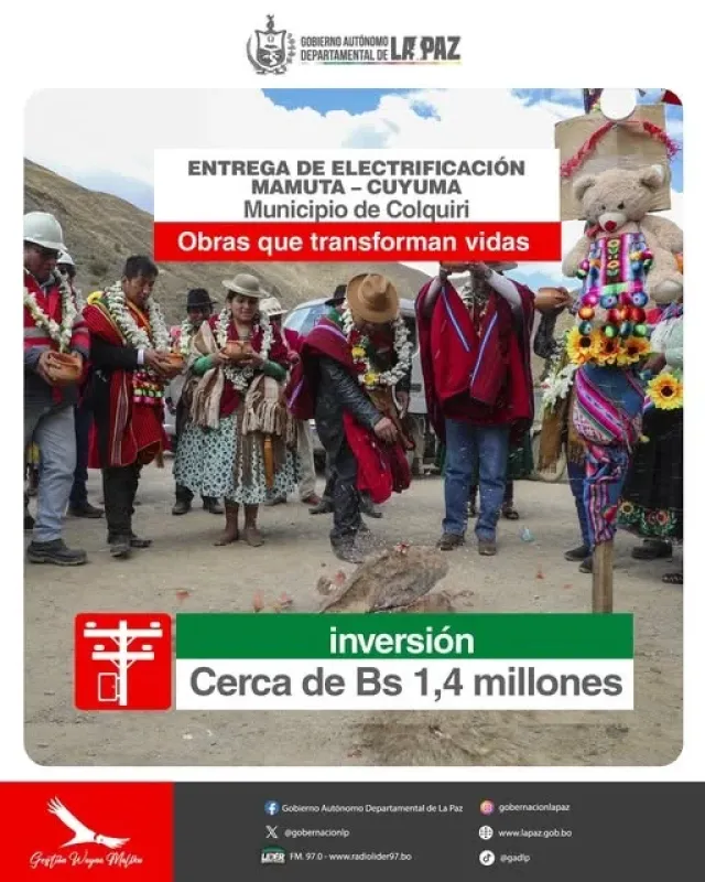 El Gobernador Msc. Santos Quispe estuvo en el municipio de Colquiri para la entrega formal del sistema eléctrico Mamuta Cuyuma el 29 de julio de 2025. El proyecto, que contó con una inversión de Bs 1,4 millones, se ejecutó rápidamente, comenzando el 05 de noviembre de 2024 y concluyendo el 15 de abril de 2025. Esta infraestructura de electrificación beneficia a las comunidades de Cebadahuma, Cañumilla, Mamuta y Cuyuma, llevando desarrollo a la provincia Inquisivi.