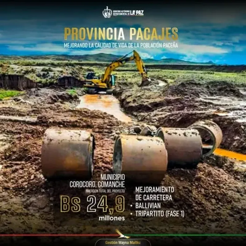 Fortaleciendo el desarrollo de los caminos de la Red Vial Departamental, se ejecuta la obra de mejoramiento y apertura de la carretera Ballivián – Tripartito (Fase 1). Este proyecto, que involucra a los municipios de Comanche y de Corocoro de la provincia Pacajes, tiene como objetivo principal impulsar el desarrollo regional. La inversión total destinada a esta Fase 1 es de Bs 24,9 millones y la obra se encuentra en ejecución.