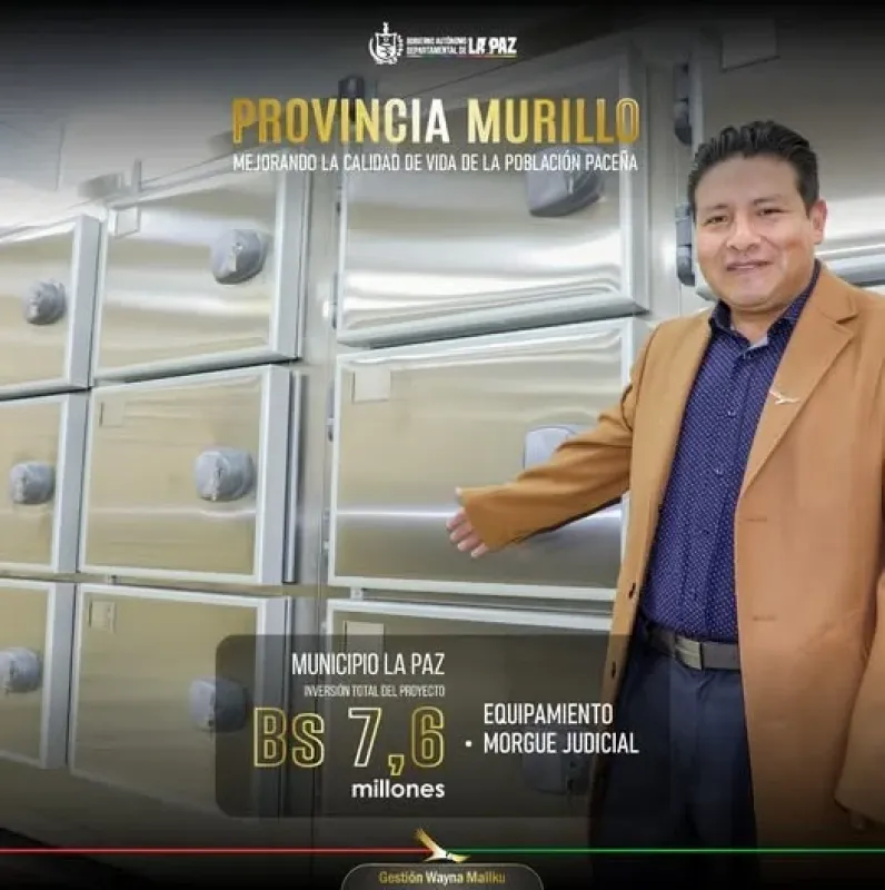 Con el objetivo de brindar mejores condiciones al personal que trabaja en dependencias forenses, el gobernador Santos Quispe inauguró las modernas instalaciones de la morgue judicial de La Paz y realizó la entrega de equipamiento moderno para esta dependencia en 2024 en la ciudad de La Paz. La obra entregada y el equipamiento representan una inversión de Bs 7,6 millones, constituyendo una mejora significativa en la infraestructura judicial de la Provincia Murillo.