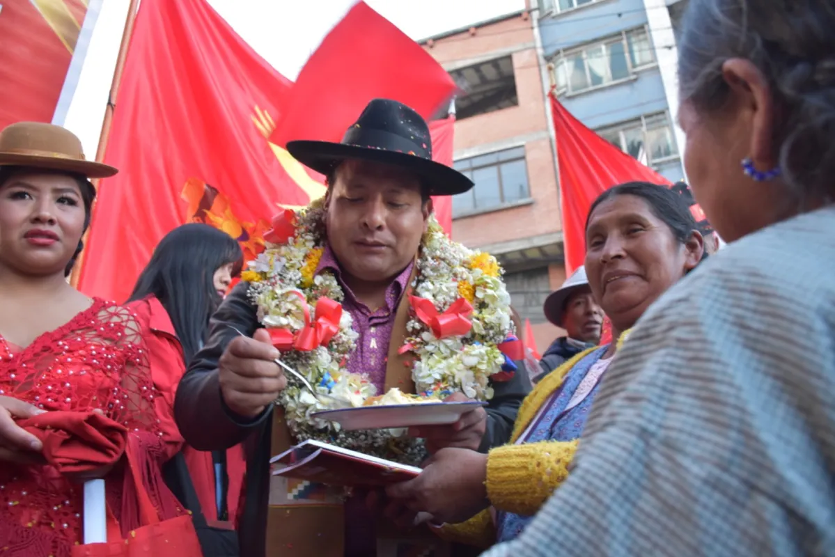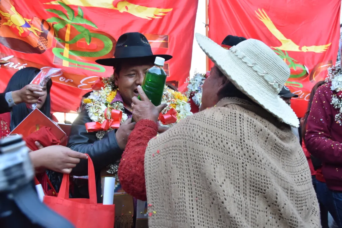 El momento cúlmine de la marcha proselitista fue al llegar a la plaza Alonzo de Mendoza. Organizaciones de comerciantes, bloques sociales de La Paz y El Alto, así como simpatizantes de las provincias destacaron la labor de la actual gestión de Santos Quispe, que se denomina Wayna Mallku.